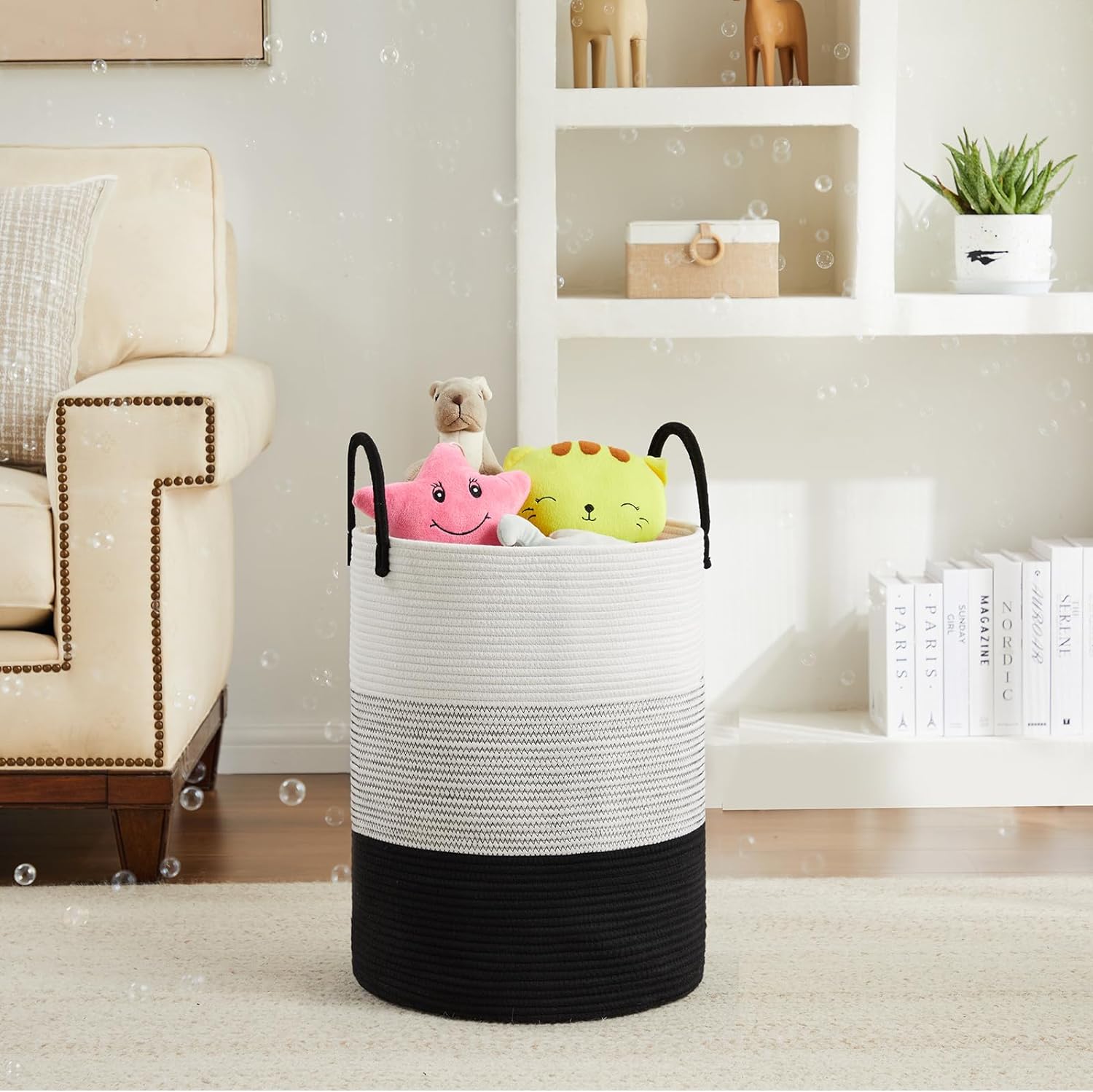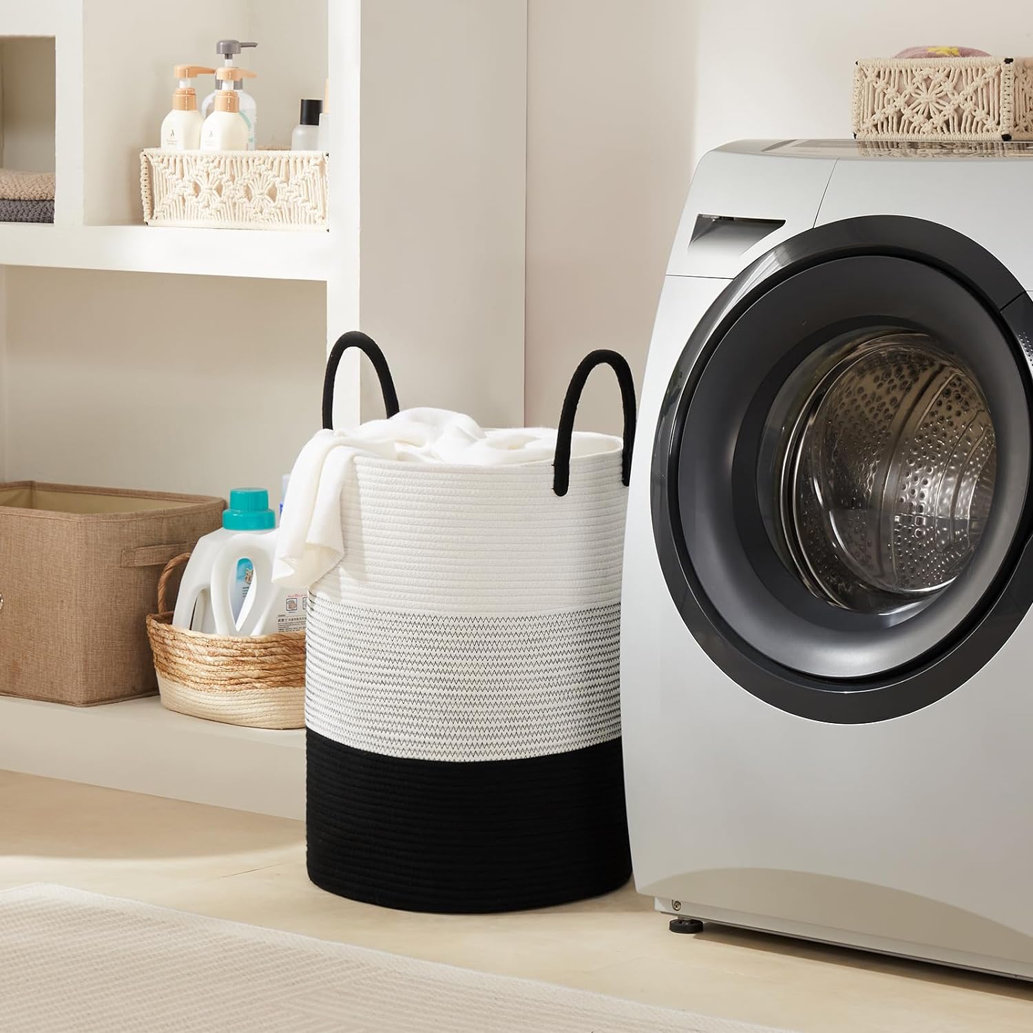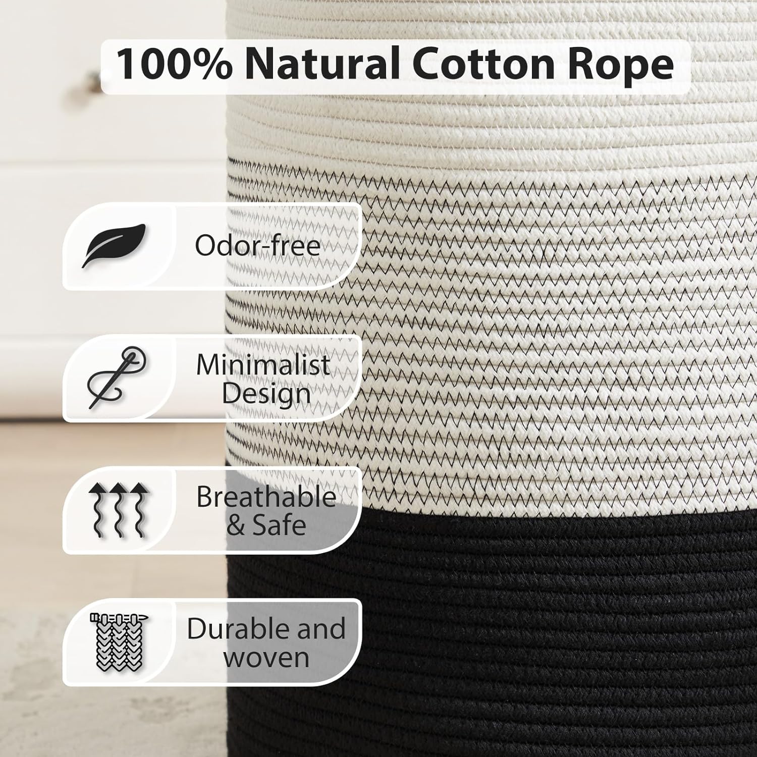 Cotton Rope Laundry Hamper by Fiona’s magic, Tall Woven Laundry Basket Storage, Baby Nursery Hamper for Blankets, Toys and Clothes Hamper for Bedroom and Living Room Organizing, 58L, Black & WhiteCreate a new description for this product from the title with 500 characters
