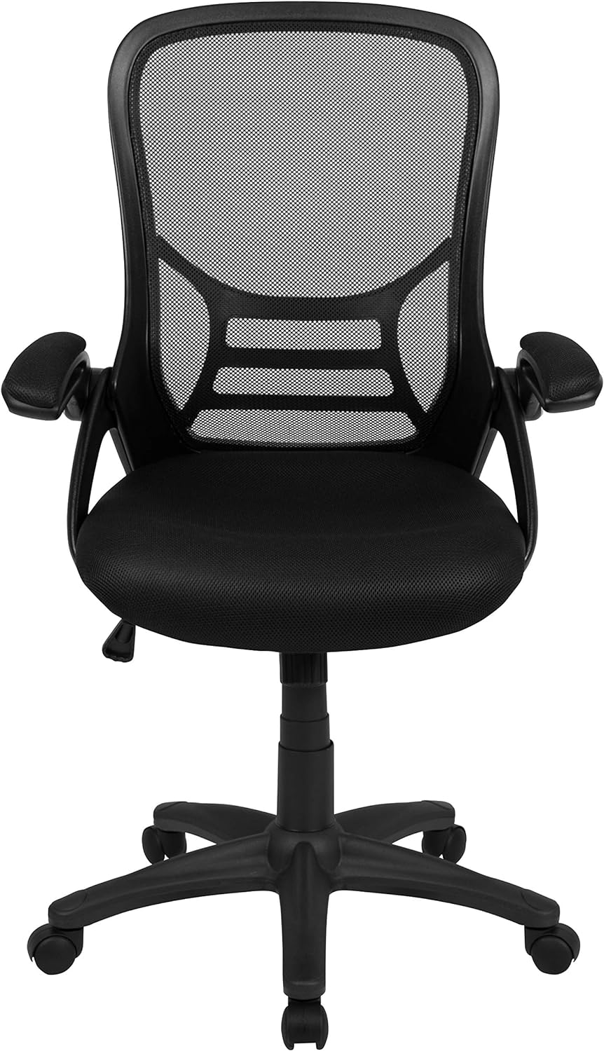 Flash Furniture Porter High Back Black Mesh Ergonomic Swivel Office Chair with Black Frame and Flip-up ArmsCreate a new description for this product from the title with 500 characters