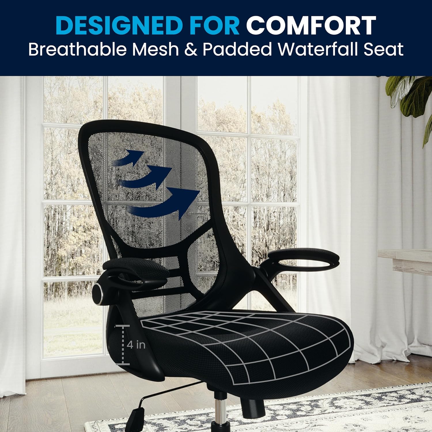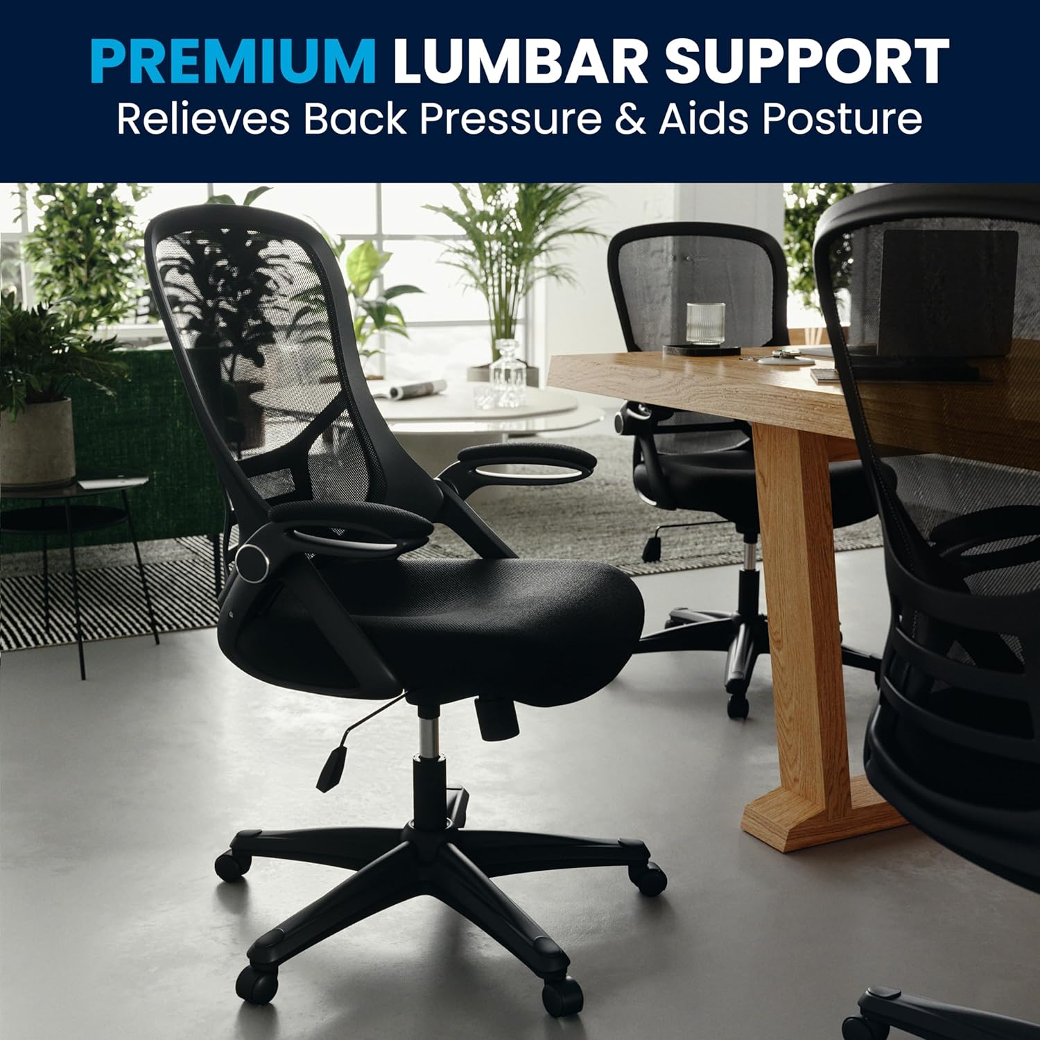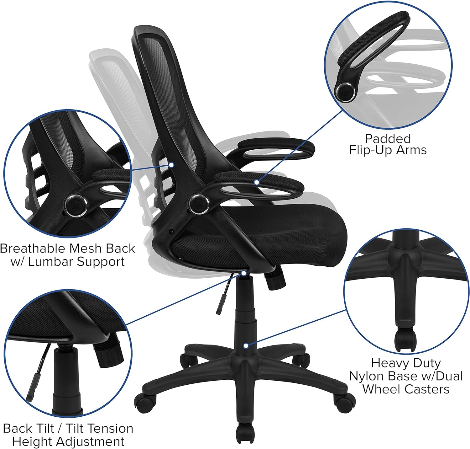 Mesh office chairs are popular due to their ventilated mesh material that allow air to circulate to your back, keeping you cool and calm. Paired with a contoured padded seat with pressure relieving waterfall edge and a high back this executive office chair will integrate into any space. If you like working with your chair raised high a flip-up arm chair is perfect allowing you to flip the arms upward like an armless chair while pulling yourself close to your desk.