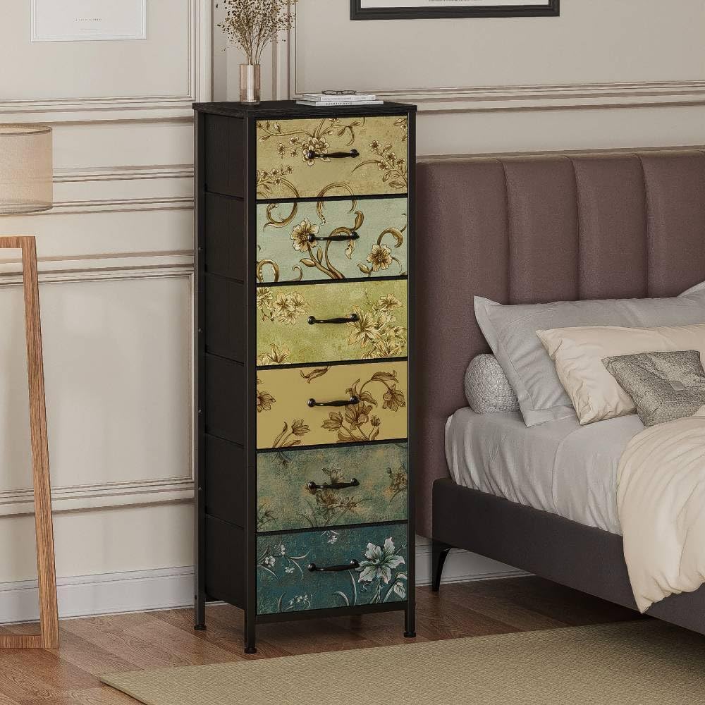 Furnulem Tall 6 Drawers Dresser, Vintage Storage Organizer Unit with Fabric Bins for Bedroom, Living Room, Closet, Nusery, Dorm, Entryway, Bedside Furniture, Sturdy Metal Frame, Wood TopCreate a new description for this product from the title with 500 characters