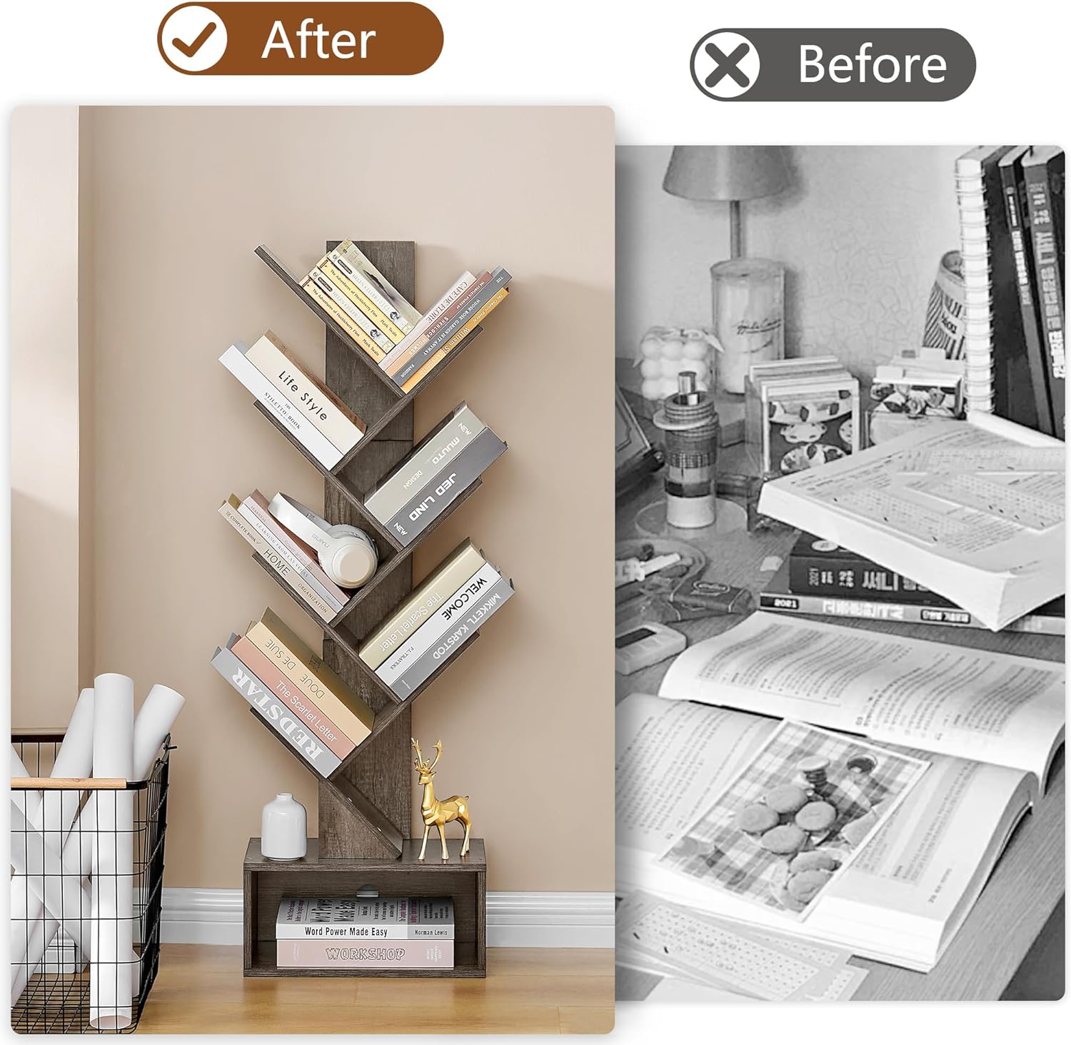 [Sturdy and Durable Construction with Considerate Design] Built to last, our tree geometric bookshelf is made from high-quality board materials with a reinforced back panel for extra strength. Each shelf can support heavy items without sagging or wobbling. We also add an anti-tip design that is suitable for families with children and pets.