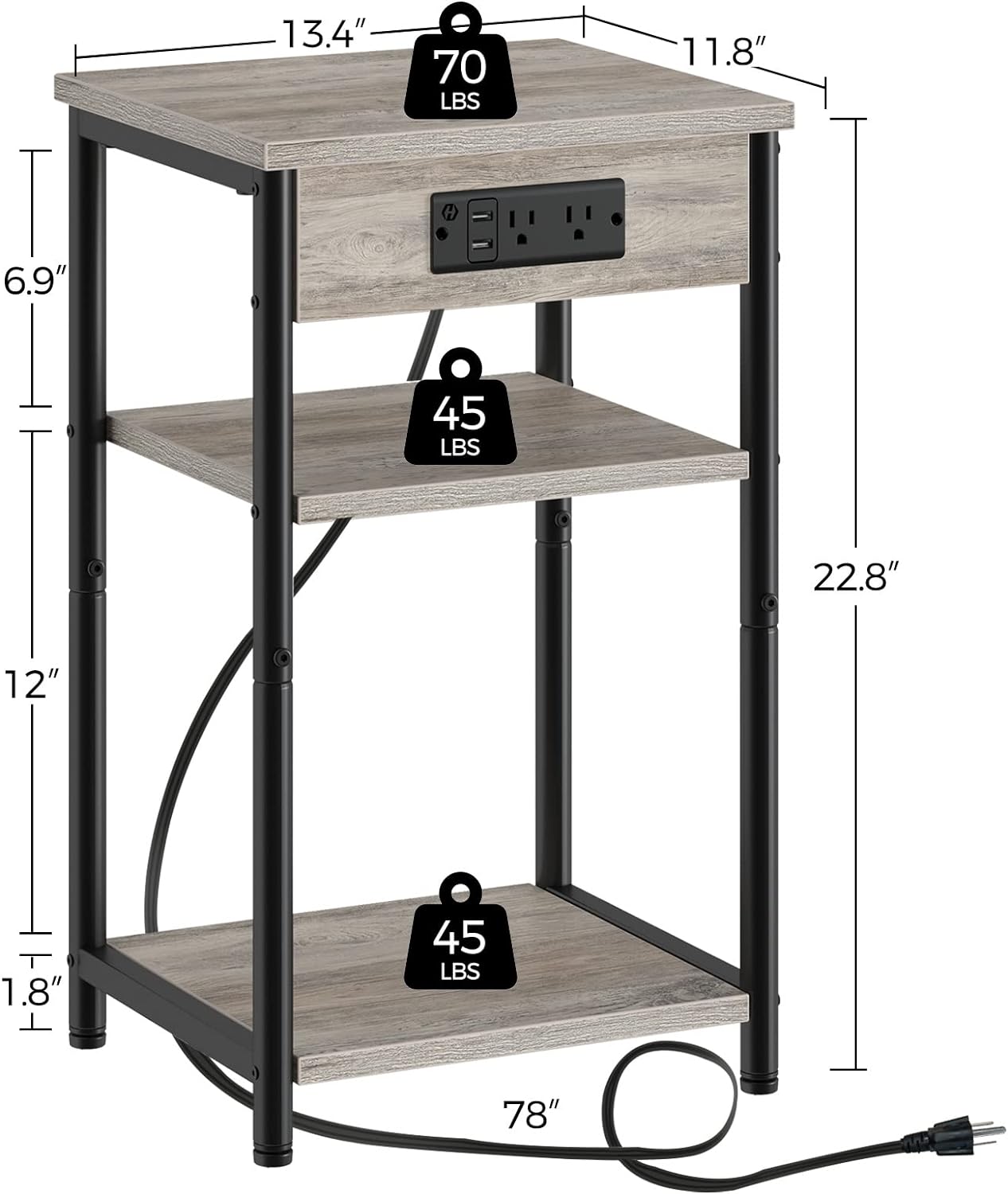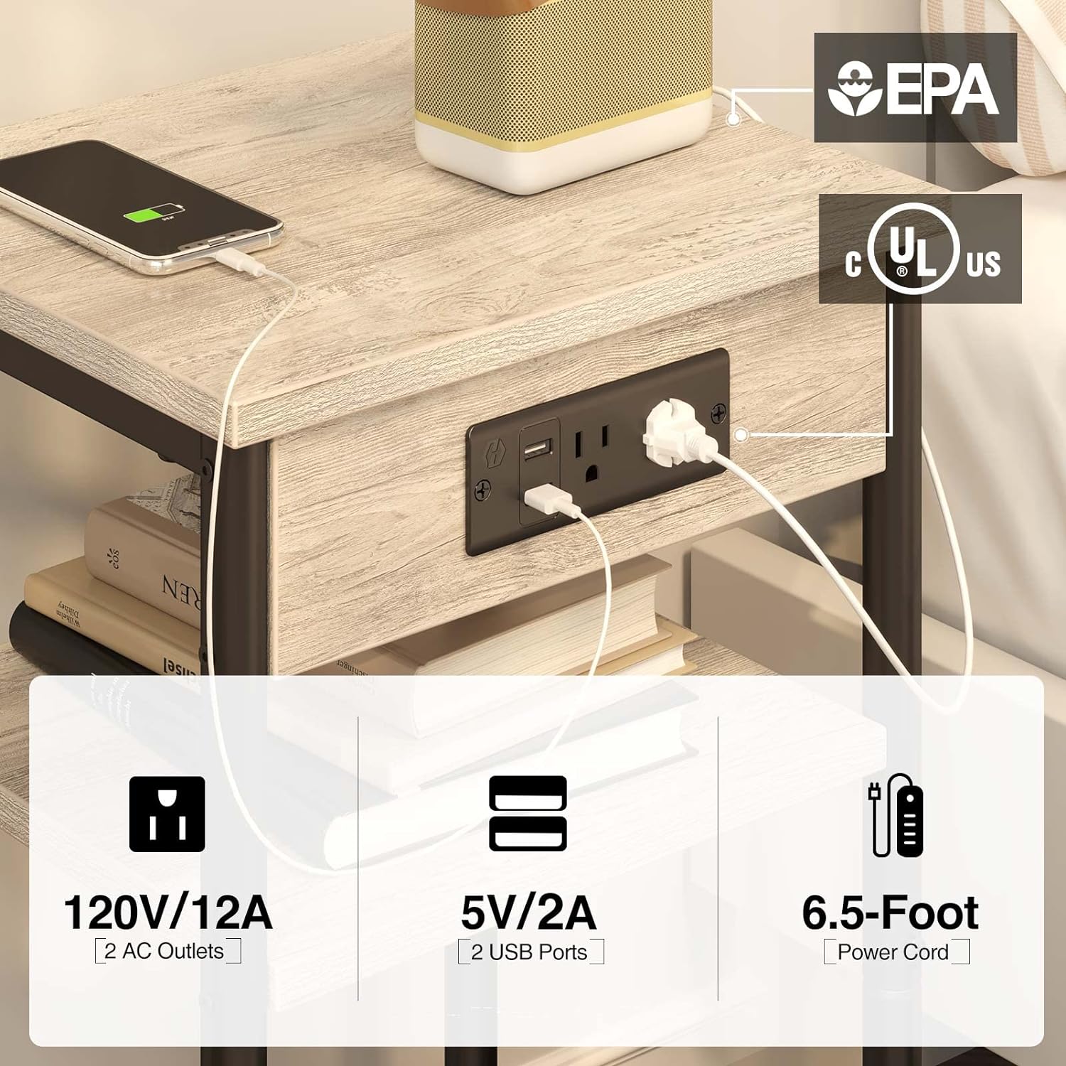 Sofa/ Bed Side Table with Charging Station: 2 standard plug outlets & 2 USB ports with 6.5 ft long power supply cord, which help you charge your phone, tablet, lamp, and game console at the same time