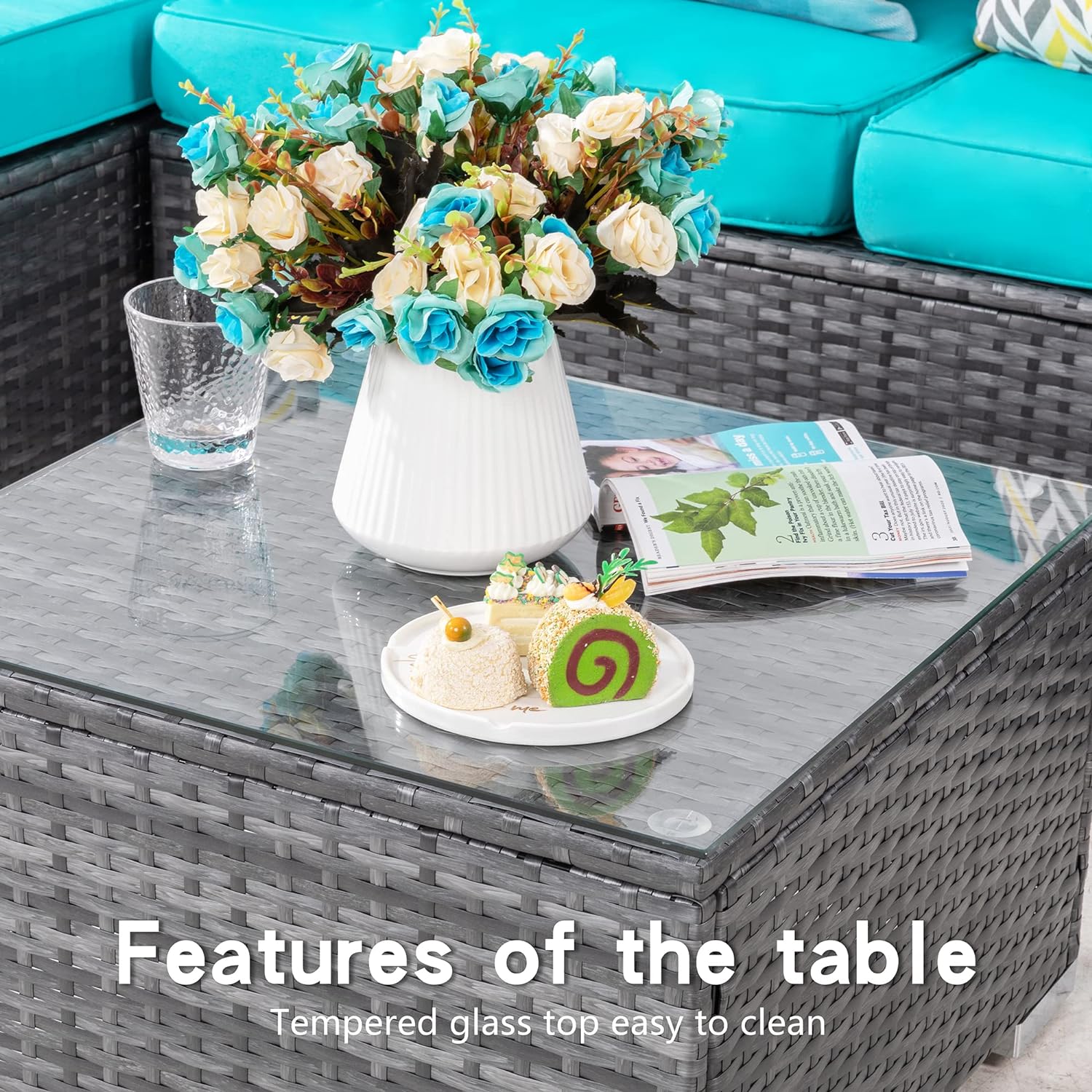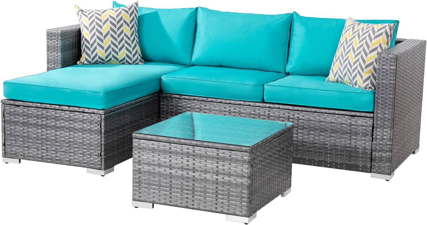 Shintenchi Patio Furniture Sets 3 Pieces Outdoor Sectional Sofa Silver All-Weather Rattan Wicker Sofa Small Patio Conversation Couch with Washable Cushion and Glass Table (Sky Blue)Create a new description for this product from the title with 500 characters