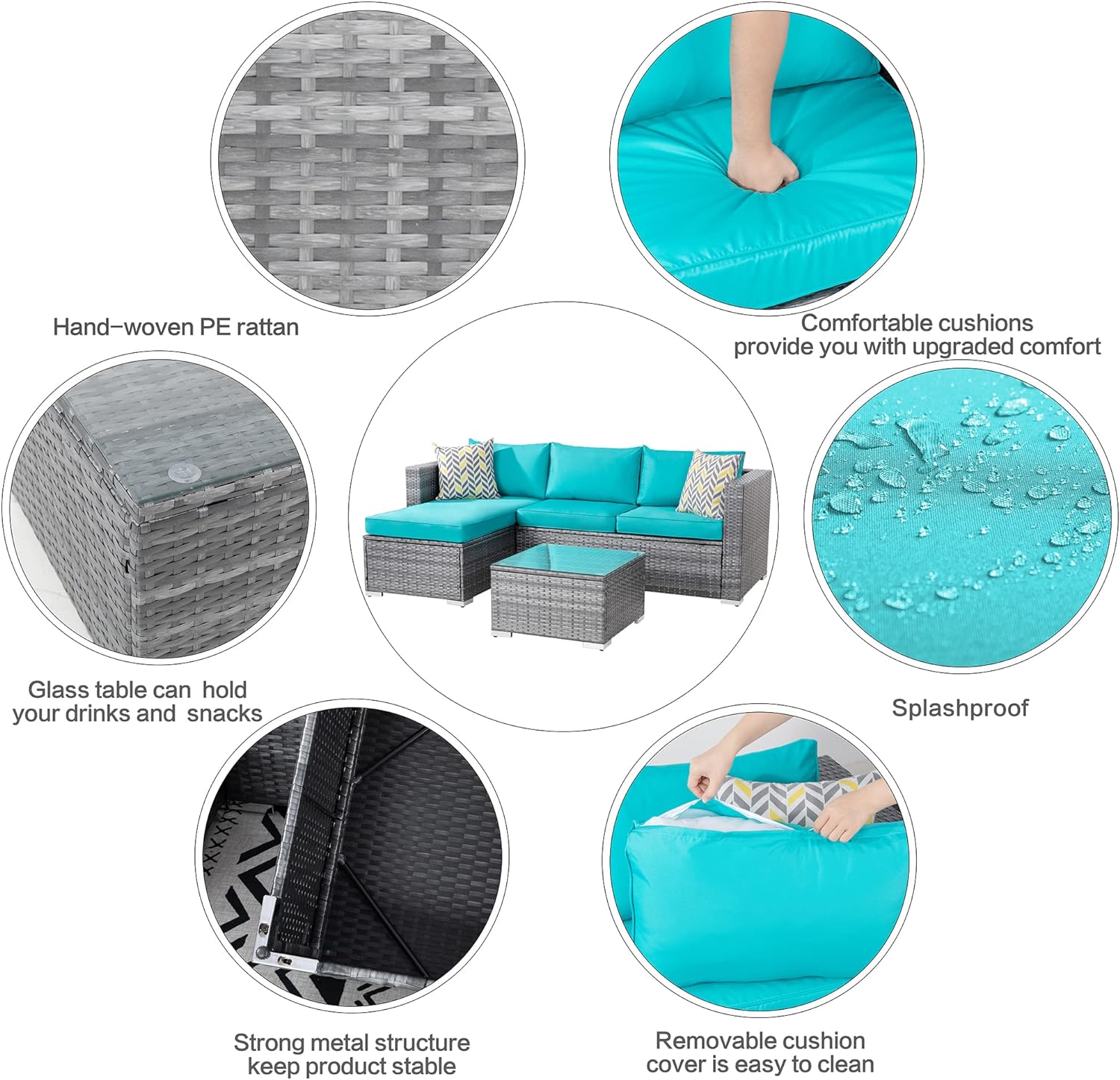 Shintenchi provides high level of patio furniture sets both in terms of quality. The PE Wicker rattan is stronger and the cushion thicker. This 3-piece outdoor sectional sofa sectional set fits up to 3-4 adults comfortably and adds the perfect experience in any outdoor space.