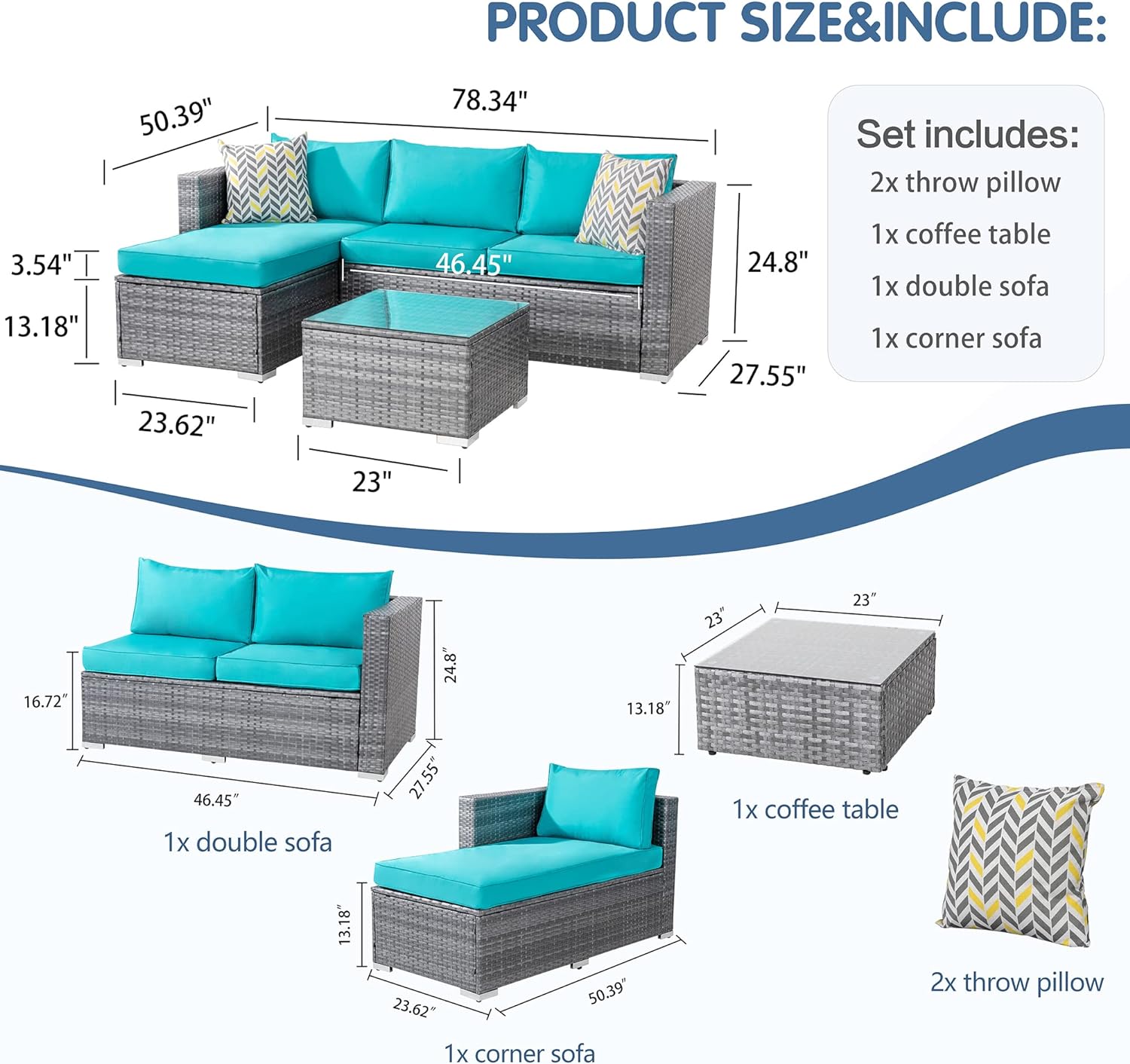 This outdoor patio sofa dimension : 78.34 x 50.39 x 24.8 inch . The patio furniture sets is divided into 2 boxes , may be delivered to different times.