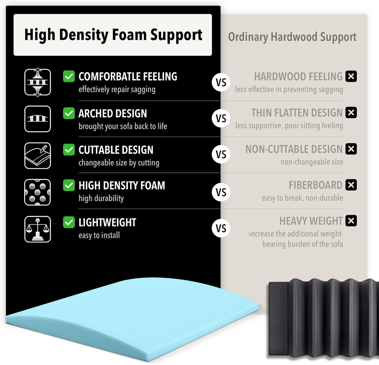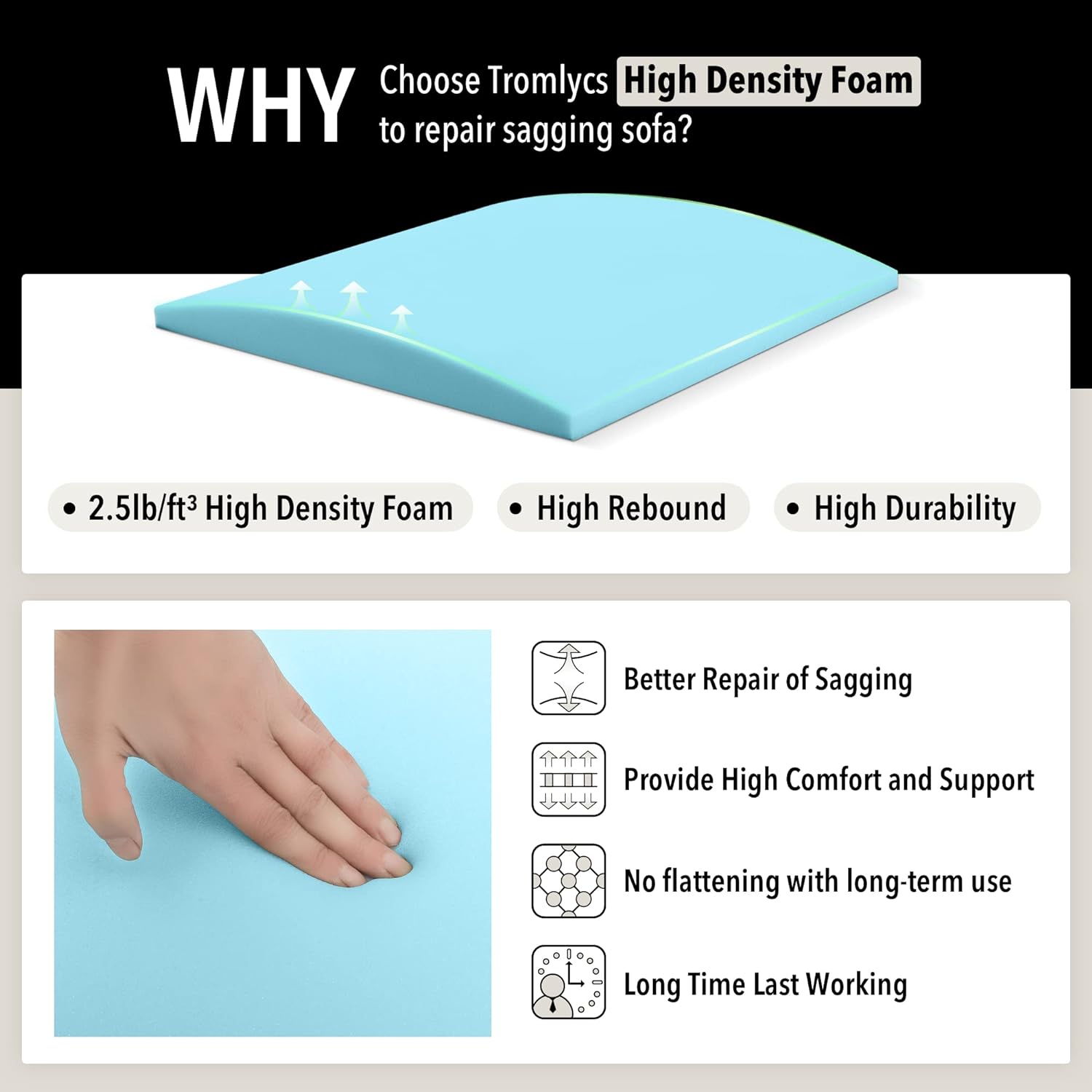 High Density Foam: Sofa sag repair is made of 40D high-density foam with high firmness, it can well improve the support of the sofa cushion; High rebound and high durability can better repair the sofa sagging