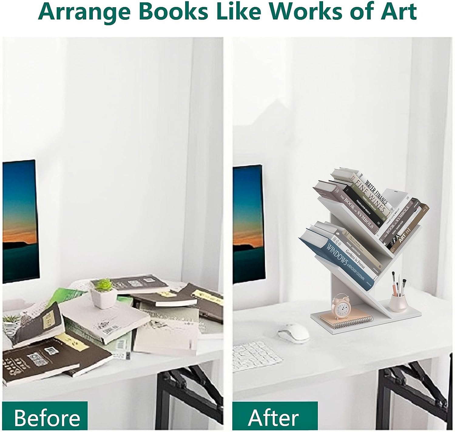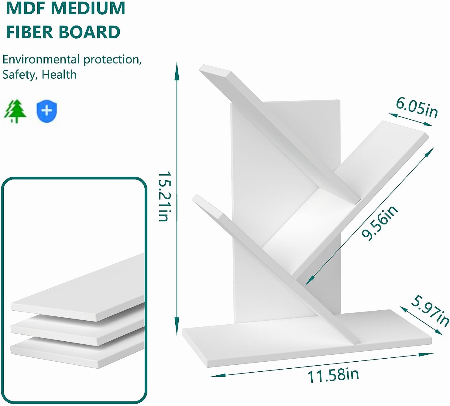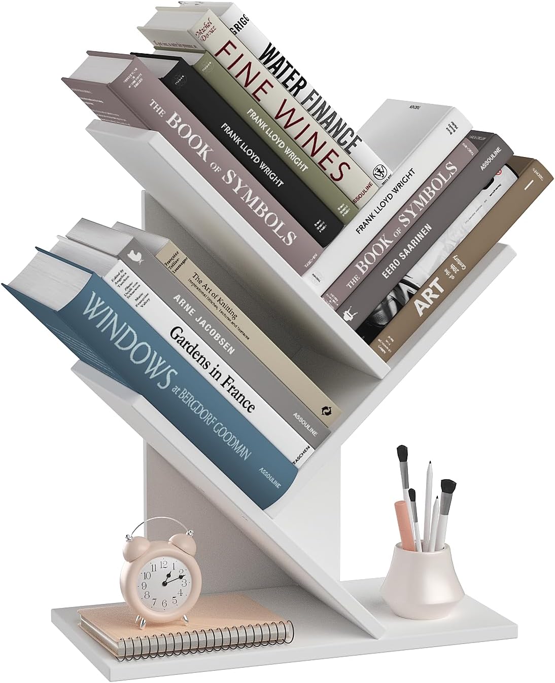 【Space Saving and Large Capacity】: Tree book shelf size: 15.21″H x 11.58″L x 5.97″W, this compact bookshelf is designed to fit seamlessly into small spaces. 5 panels and 4 shelves design, each shelf can be loaded with up to 5-12 books, perfect for storing books, plants …… you can put all your treasures on it!